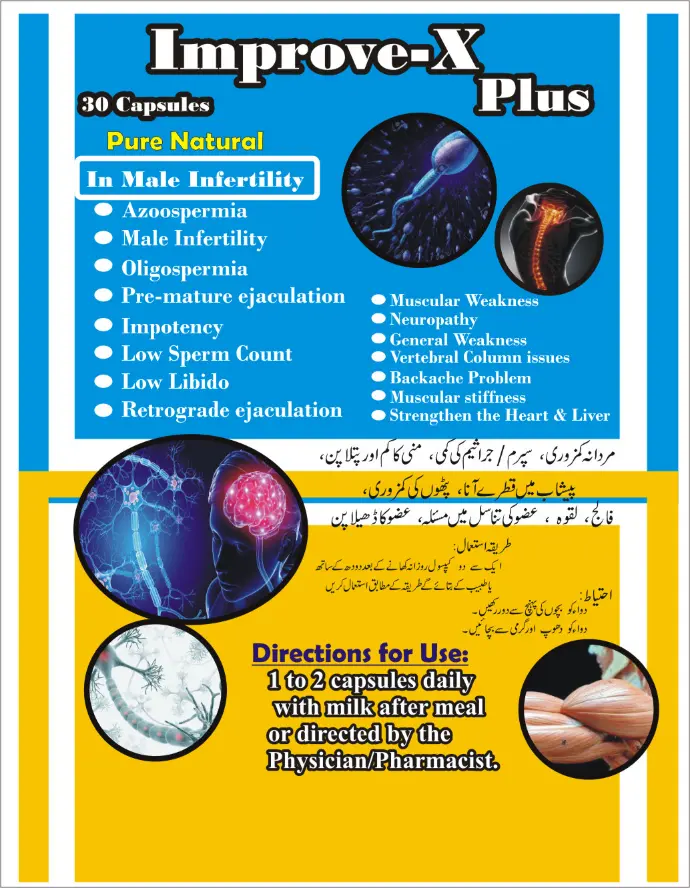 A very powerful Sexual tonic for male infertility. it is pure natural and very effective in (Azoospermia, Oligiospermia, Infertility, Erectile dysfunction, low libido, low sperm count, pre-mature ejaculation, Retrograde ejaculation, pus cells in sperm count) and all that reasons underlying in infertility issue.